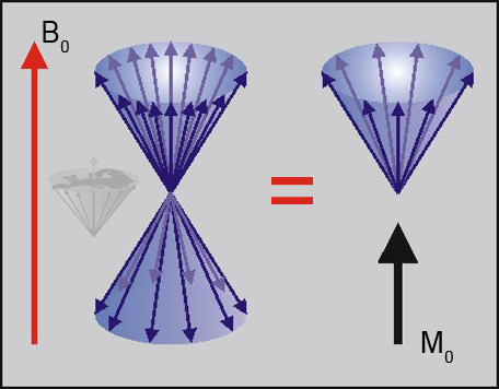 Alineamiento de los momentos magnéticos individuales con el campo externo. La población del estado de alta energía es ligeramente mayor. La suma de todos los componentes individuales es la magnetización macroscópica o magnetización neta M₀.