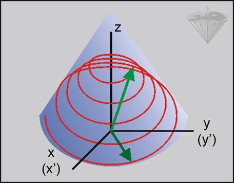 El movimiento en espiral del extremo de la magnetización durante una excitación por RF ilustrado en un marco estacionario. El marco giratorio representa solo los ejes azules y las flechas verdes. Para distinguir cuando estamos utilizando el marco de referencia giratorio, llamamos a los ejes x e y con la notación x' e y'. El mismo procedimiento puede usarse para z, pero z y z' son idénticos.