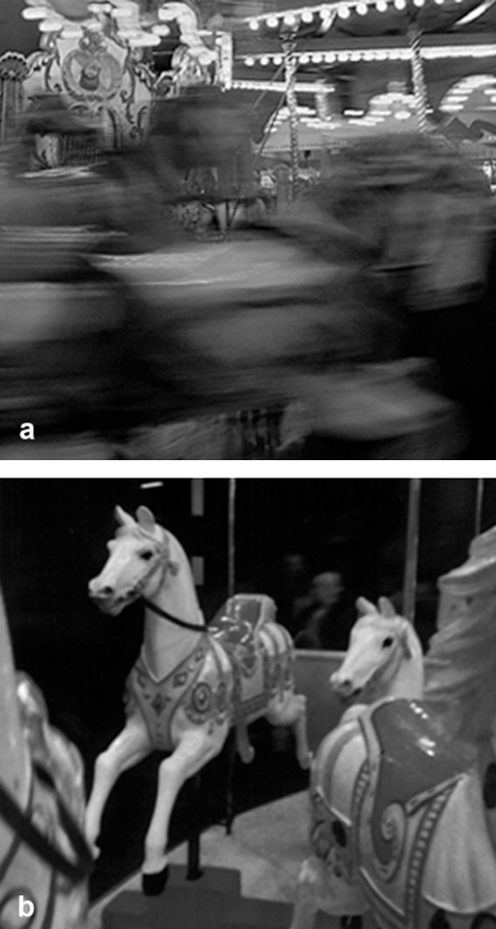 Observando los caballos en un carrusel (a) desde lejos y (b) al subirnos al carrusel. De lejos los caballos se verán borrosos y, si se están moviendo rápidamente, no será fácil distinguirlos. Si nuestro punto de referencia está dentro del carrusel, será mucho más fácil distinguir a los caballos y sus rasgos.