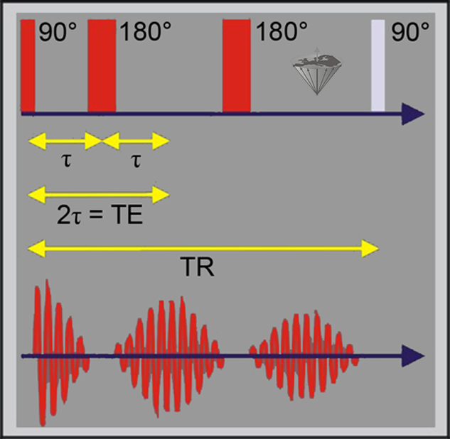 Secuencia de pulsos espín-eco. El sistema de espines se excita con un pulso de 90°. Después de un tiempo de retardo (τ) se aplican uno o más pulsos de 180°. Esto conlleva a la formación de un eco. El tiempo entre el pulso de 90° y el pico del eco se conoce como tiempo de eco TE (=2τ). TR es el tiempo de repetición entre dos secuencias de pulsos completas.