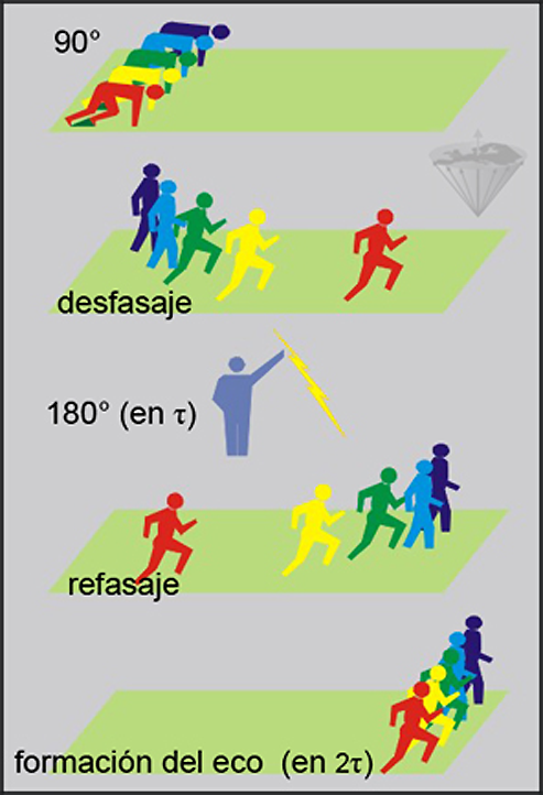 En el momento de aplicar el pulso de 90° todos los corredores están alineados en el punto de partida. Después del pulso, los corredores más veloces se separan de los más lentos (desfasamiento).