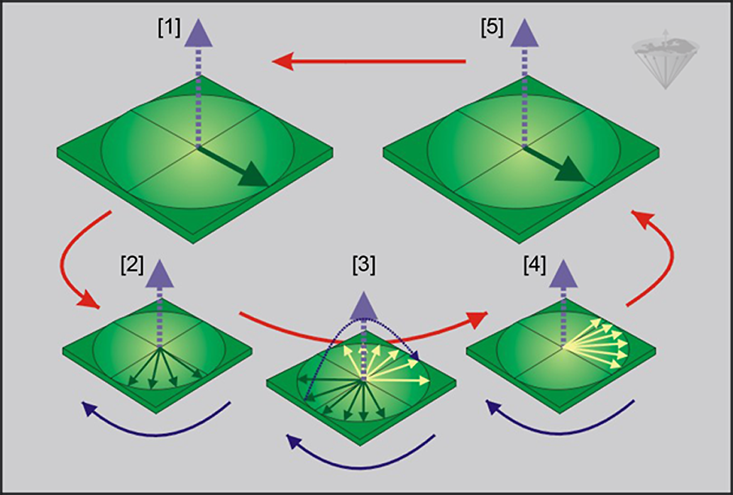 El pulso de 180° cambia la fase de cada espín en 180°, es decir, la invierte. La posición de los espines no cambia, por lo que seguirán girando en la misma dirección. Sin embargo, el pulso de 180° hace que los espines vuelvan hacia su punto de partida (alineación), en lugar de girar alejándose del mismo, como se muestra en la Figura 04-19.