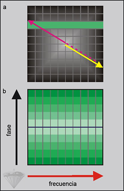 Now we have filled the data matrix with each row containing information from one echo. Each data point is then Fourier-transformed in the x-direction, which leads to a new data matrix where every point in each column contains information stemming from a certain frequency; the phase information differs point-by-point per row.