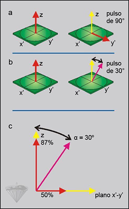 (c) In our example α equals 30°. This results in a reduction of the longitudinal magnetization to 87%, whereas the transverse magnetization is 50% of the available longitudinal magnetization.