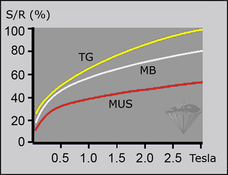 Behavior of the relative signal-to-noise ratio (S/N, in percent) versus field strength in a T1-weighted pulse sequence. The best possible increase is been depicted.