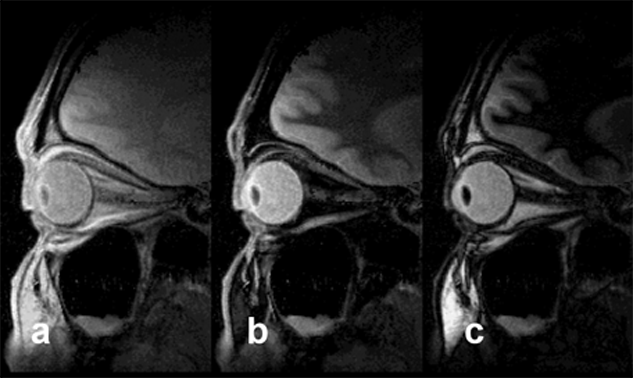 STIR. In all images, TR = 4000 ms, TE = 10 ms; (a) TI = 50 ms, (b) TI = 240 ms, (c) TI = 450 ms. The fatty tissue close to the optic nerve disappears with a TI of approximately 240 ms. Signal suppression is based on T1 relaxation times and not tissue specific. STIR should be used before injecting contrast agents.