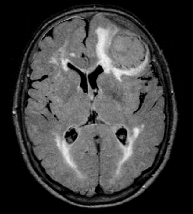 FLAIR. TR = 8000 ms, TE = 120 ms, TI = 2000 ms. The brain lesions caused by the pressure of huge meningioma are well seen on the FLAIR image.