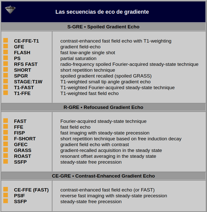 Some rapid imaging techniques correlated to the respective generic pulse sequence. Note: In this context, contrast-enhanced refers to the RF pulse sequence; is does not mean enhancement with a contrast agent. A detailed review can be found in a paper by Chavhan and collaborators [⇒ Chavhan 2008].