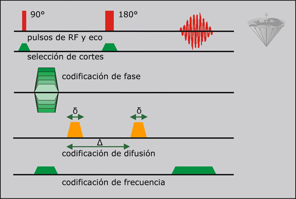Diffusion-Weighted Imaging (DWI) is commonly performed in the three orthogonal directions x, y, and z created by the existing gradient coils of the MRI machine. A Carr-Purcell spin echo sequence is adapted to diffusion imaging by the addition of two gradient pulses at a duration δ and a time difference Δ, the diffusion time (Figure 11-09).