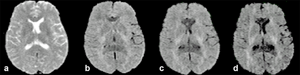 (a) b = 0 s/mm² (no diffusion weighting); (b) b = 600 s/mm²; (c) b = 900 s/mm²; (d) b = 1200 s/mm².