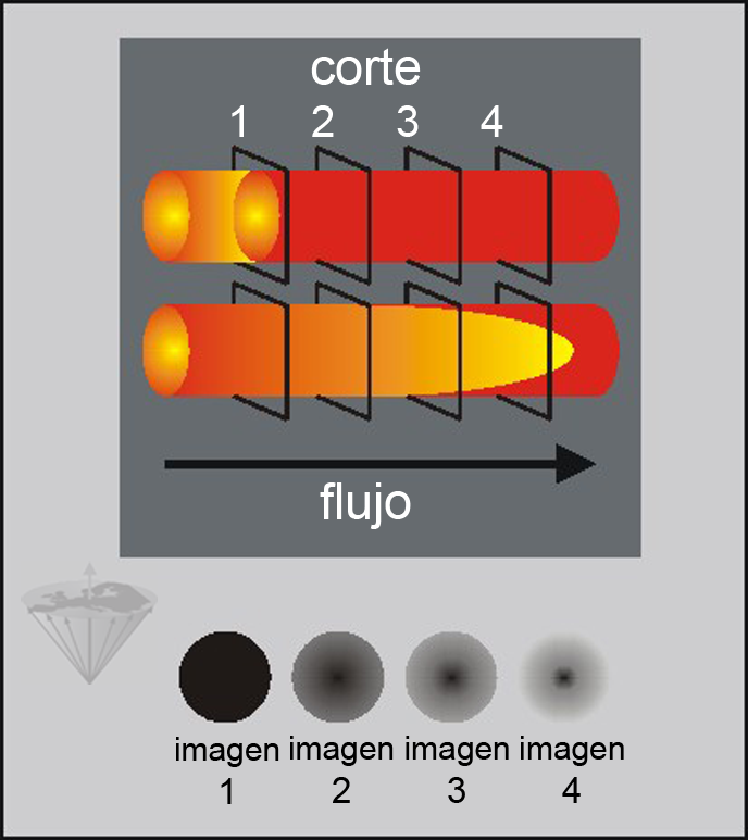 Flow-related contrast enhancement in multiple slice SE images. The dark gray depicting the spins in slice 1 illustrates the fate of these spins while flowing through the imaged region. Because parabolic laminar flow possesses a higher velocity in the center, doughnut shaped patterns develop. This kind of flow enhancement is not pathological.