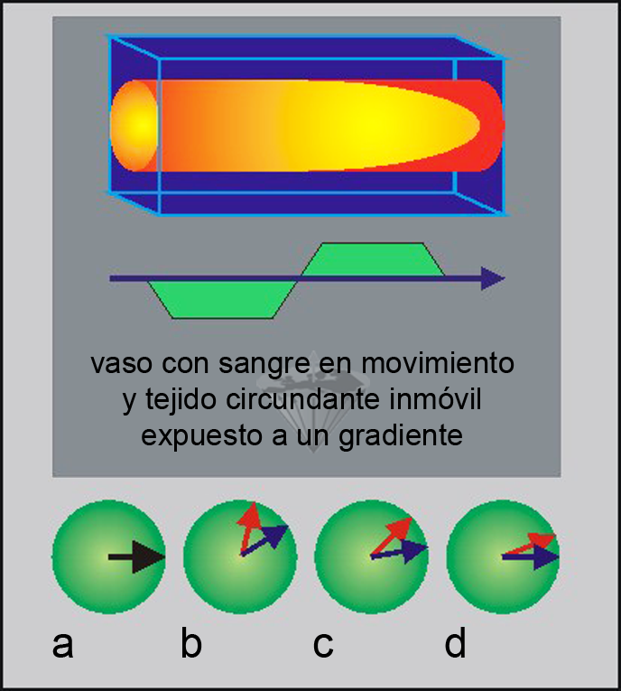 The red dephasing arrows represent flowing spins; the blue dephasing arrows represent stationary spins.