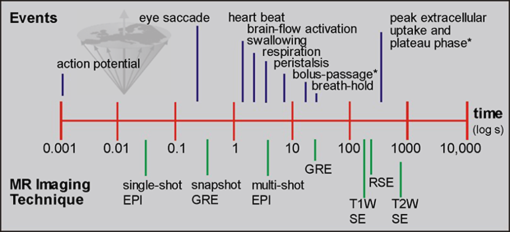 A graphic depiction of the time scale of different events in man versus MR imaging methods. Imaging speed must be 3-10 times faster than the event to be monitored or avoided.