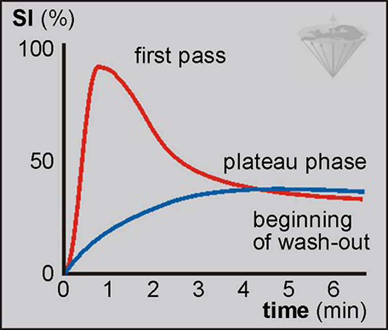 The enhancement processes can be monitored by time-intensity curves. Although both the vascular and the extracellular phase of uptake go hand in hand, one must distinguish monitoring the dynamic signal-intensity changes of the first pass of a contrast agent bolus such as in brain and heart imaging and the slower tissue uptake as it is commonly done in breast lesions.