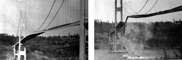 La caída del puente Tacoma Narrows en el estado de Washington (E.E.U.U.) en Noviembre de 1940 fue causada por fuertes vientos que hicieron que la estructura oscilara. La resonancia puede contribuir a este tipo de accidentes.