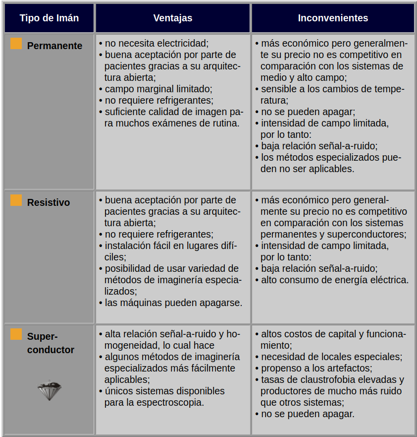 l campo magnético de un sistema de RM se puede generar mediante diferentes sistemas de imanes: permanentes, resistivos y superconductores. Cada uno de ellos presenta características diferentes y se utilizan de diferentes maneras.