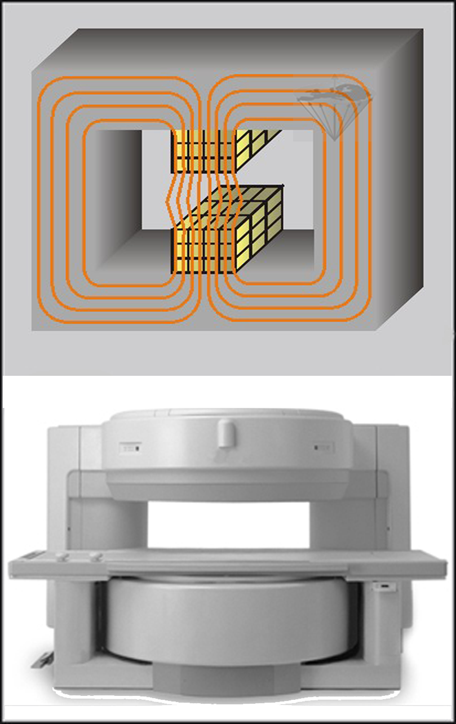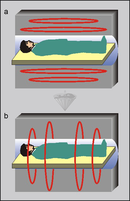 Cortes a través de dos tipos de electroimanes resistivos en forma de túnel. Las cuatro lazadas de alambre que crean el campo magnético estático pueden arreglarse de forma (a) paralela o (b) perpendicular a la mesa del paciente; la orientación perpendicular (de cabeza a pies) es la más común.
