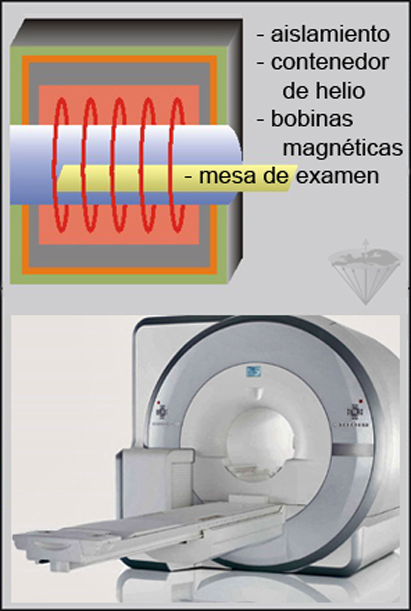 El campo magnético se produce cuando la corriente eléctrica pasa a través del circuito de alambres enfriados por el helio líquido que los rodea. La energía eléctrica se desconecta una vez el sistema se ha cargado y opera a la intensidad de campo deseada. Las máquinas más recientes ya no requieren un contenedor con nitrógeno.