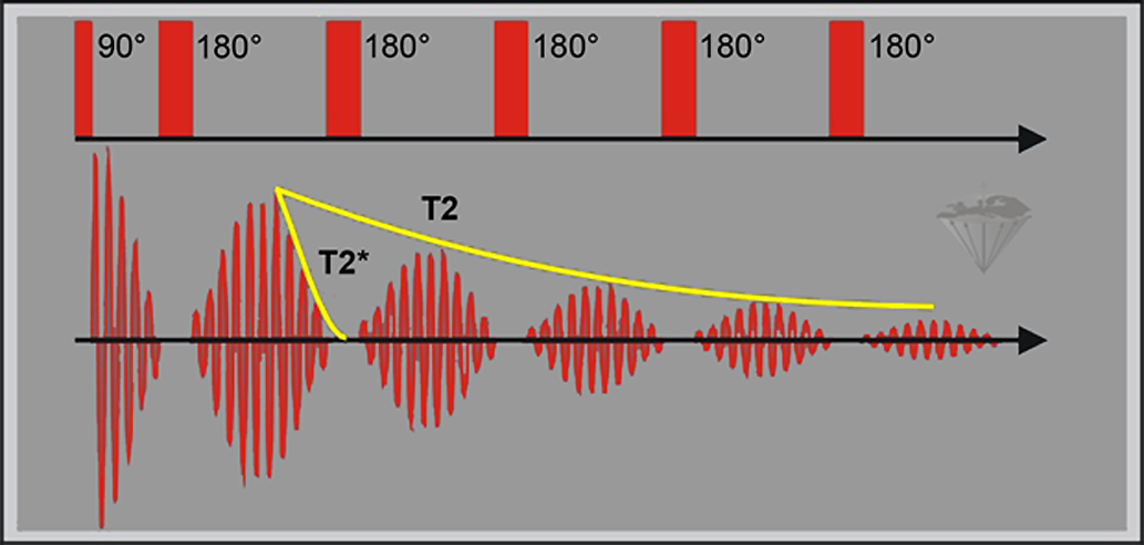 El decaimiento de señal después del pulso de 90° y en ambos lados del centro del eco del espín se rige más por T2* que por T2. Por lo tanto la señal decae rápidamente lejos del centro del eco.