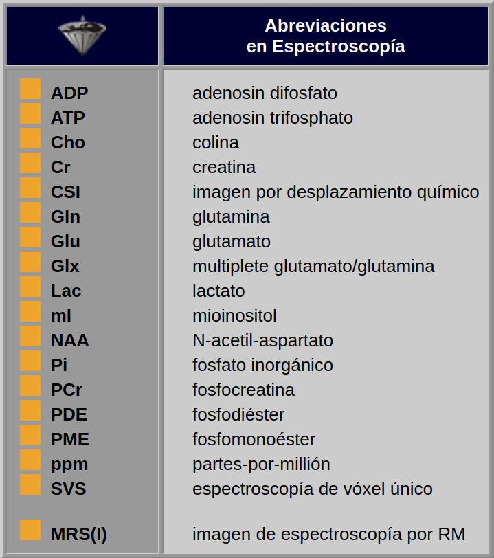 La Tabla 05-01 presenta algunas abreviaciones importantes utilizadas en espectroscopia por RM.