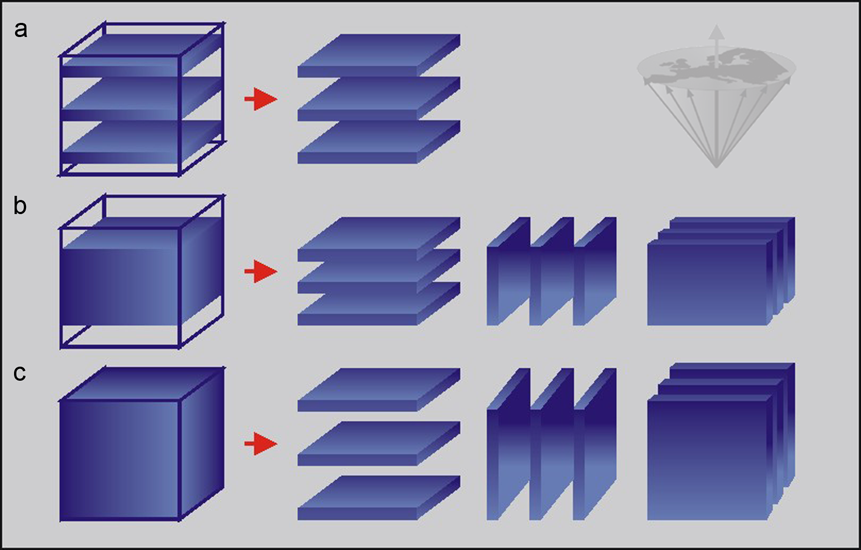 (a) 2D multiple slices; (b) 3D slab, which can be used to create 2D slices; (c) 3D volume, which can be used to calculate slices in any direction of the entire volume.