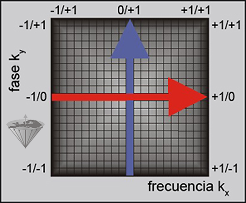 The coordinates of k-space are called spatial frequencies (measured in cycles per millimeter). They are filled depending on gradient strength of the frequency-encoding gradient (readout gradient: red arrow; x-direction) and phase-encoding gradient (preparation gradient: blue arrow; y-direction), moving from low gradient strength (-1) to zero gradient strength in the center (0) and high gradient strength (+1).