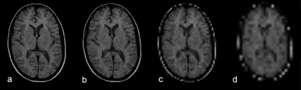 Spatial resolution and partial volume effects: matrix size (a) 256×256, (b) 128×128, (c) 64×64, and (d) 32×32. Due to the partial volume effects, anatomic details disappear.