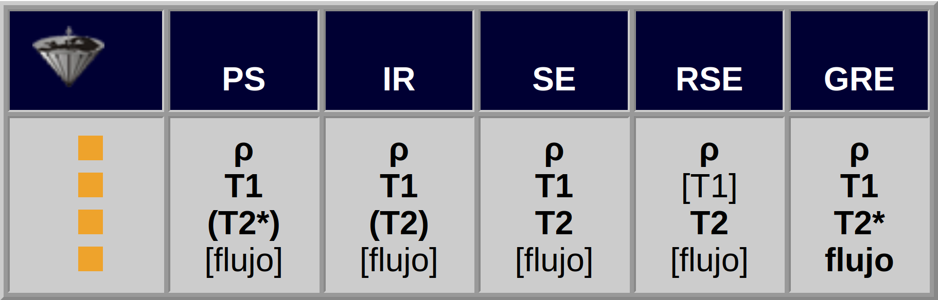 Pulse sequences and their contrast dependence. The signal of all pulse sequences is influenced by ρ and by bulk flow.
