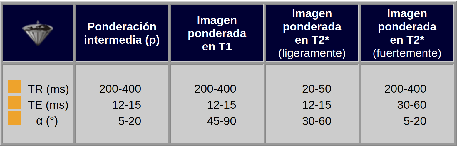 Table 10-07 summarizes the features of a standard GRE (FLASH) sequence at high field (1.5 Tesla). A fine review of fast and ultrafast gradient echo sequences (including additional sequences to those mentioned here) was published by Nitz [⇒ Nitz 2002].