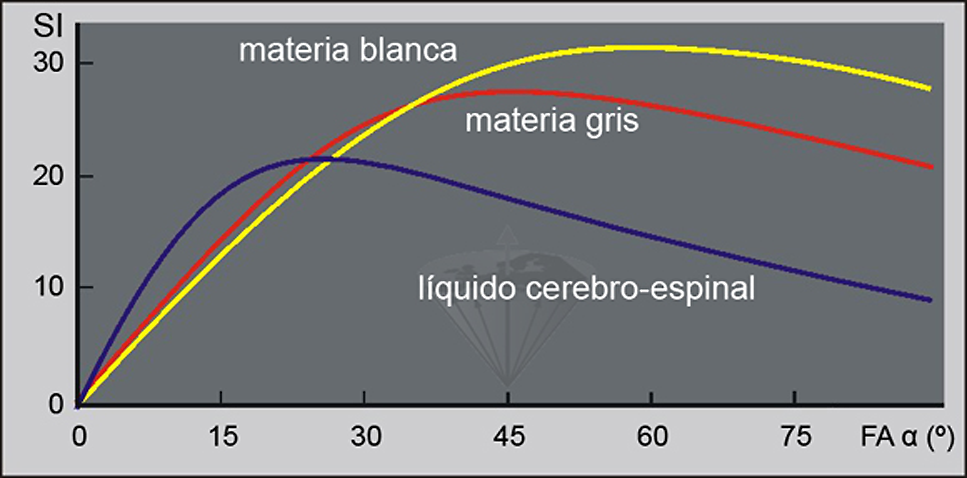 Figures 10-12 and 10-13 depict the typical signal intensity behavior of a GRE sequence, in this case a spoiled FLASH sequence. Commonly, the signal intensities reach a maximum between 30° and 60°.