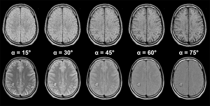 Gradient echo sequence (spoiled GRE). TR = 400 ms; TE = 20 ms. B₀ = 1.5 T. Because of the three variables available, there are nearly unlimited possibilities for changing image contrast. Generally, at low flip angles proton density dominates contrast, at high flip angles T1 becomes more important.