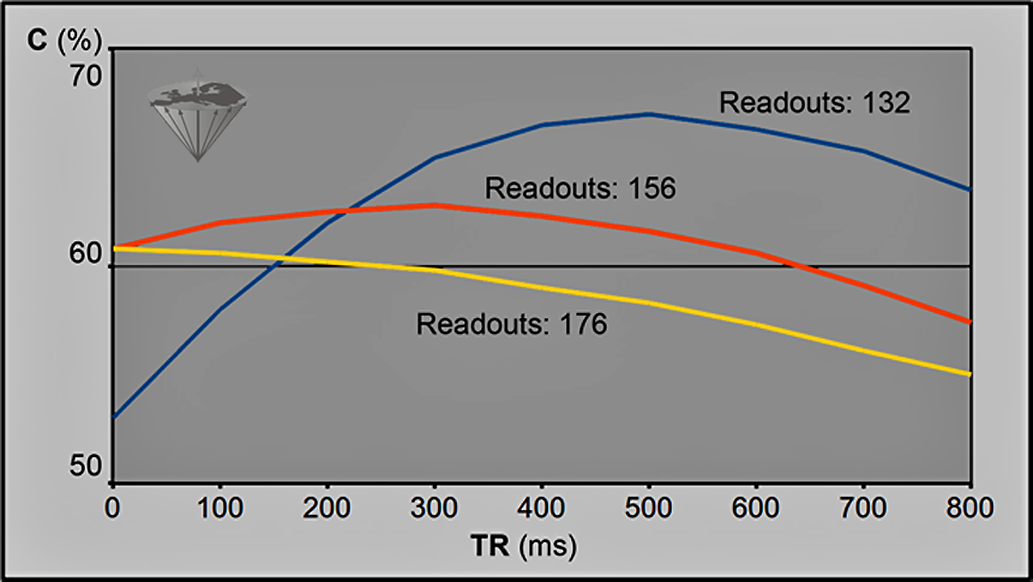 Image contrast is a function of N, TI, τ, the flip angle and the temporal position of the readout RF pulse, as well as the regular factors influencing contrast such as relaxation times. Generally, the total number of RF pulses N is related to the spatial resolution along the slice direction.