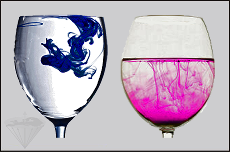 Distribution in water of blue ink from the top and potassium permanganate from the bottom of the glass. This kind of molecular movement is easily visible. Diffusion inside the body is far more difficult to explain, to conceptualize — and to unveil.