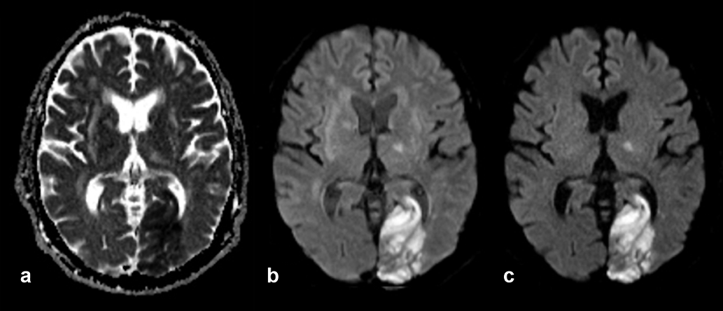 (a) ADC image, the area of the infarction is dark; (b) diffusion-weighted image, b = 500 s/mm²; (c) diffusion-weighted image, b = 1000 s/mm². The area of the infarction is bright.