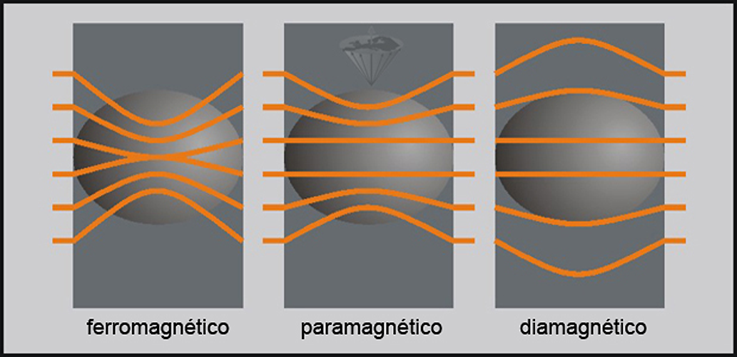 For diamagnetic material, the value of susceptibility is always negative; for pa­ra­mag­ne­tic, superparamagnetic, and ferromagnetic sub­stan­ces positive. Figure 12-03 shows the response of diamagnetic, paramagnetic, and fer­ro­mag­ne­tic substances to an outside magnetic field.