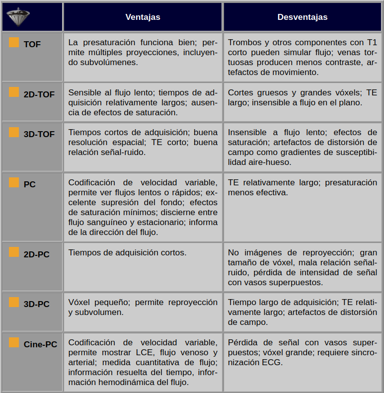 Advantages and disadvantages of various TOP and PC imaging techniques used for MRA.