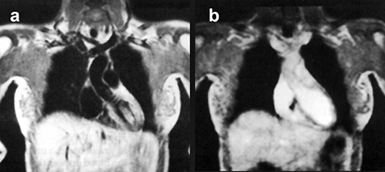 Figure 14-10 shows that in the spin-echo image, flowing blood within the heart chambers and the ascending aorta is black, whereas in the gradient-echo image, flowing blood appears bright.