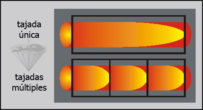 Saturation effects associated with thick slabs can be partly overcome with a technique called multiple overlapping thin slabs acquisition (MOTSA). Instead of one thick slab, several smaller slabs are acquired.