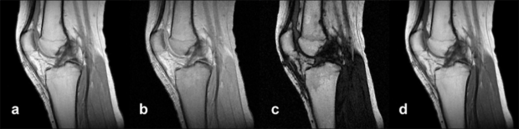 Simulation of an MR examination of a normal knee at 1.5 T. Series of synthetic inversion-recovery images; parameters TR|TE|TI: (a) 1000|10|20; (b) 1000|10|100; (c) 1000|10|260; (d) 1000|10|500.