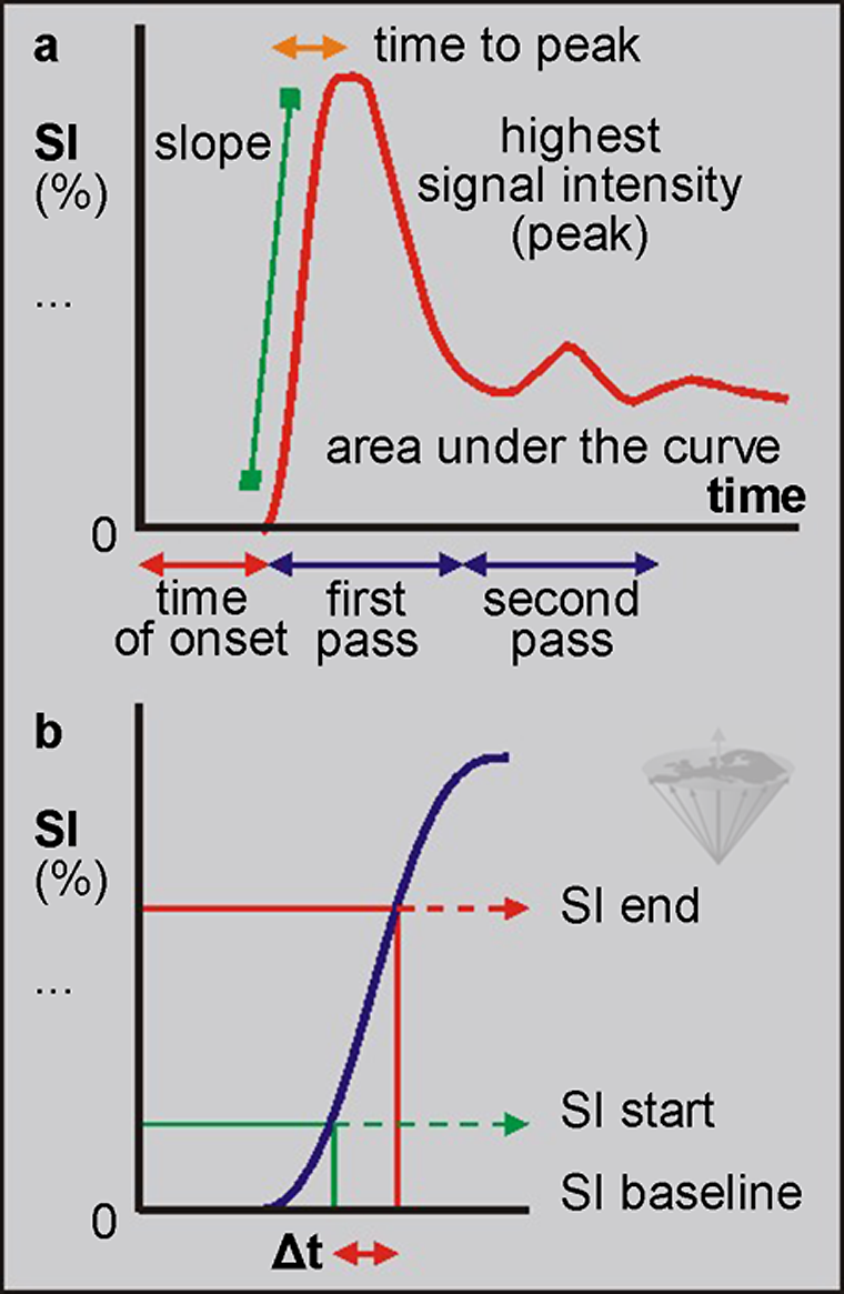 Parameters of bolus injection of a T1 contrast agent. The maximum wash-in slope is considered one of the most important parameters, indicative of, e.g., tumor vascularity. It can be calculated as follows: (SIend - SIstart / SIbaseline × Δt) × 100 [% / s].