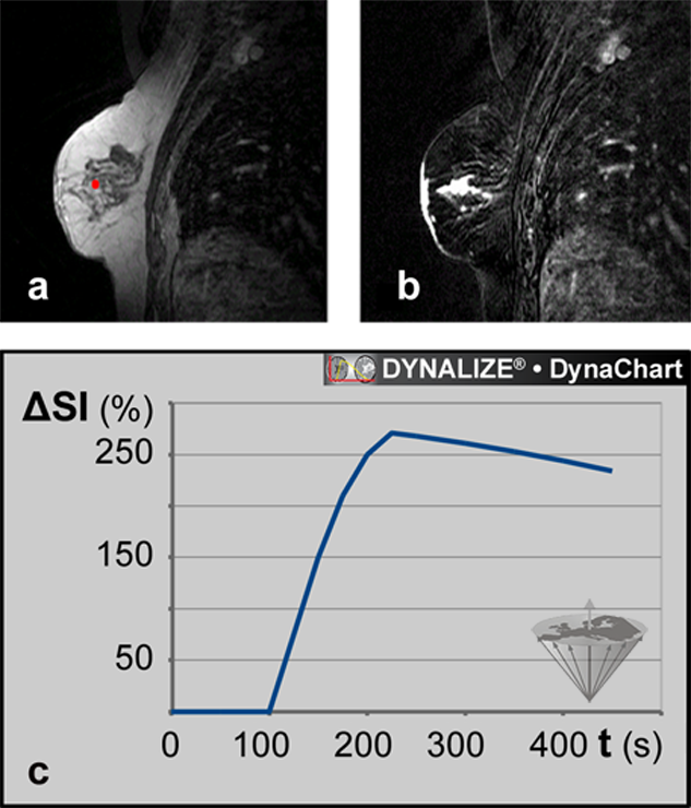 For instance, enhancement of more than 90% in less then 90 seconds on T1- weighted images, or signal intensity loss of > 20% during the first 30 seconds after contrast material injection on T2*-weighted images, is considered typical for malignant breast lesions, although not all malignant lesions follow this pattern (Figure 16-08) [⇒ Boetes 1994, ⇒ Flickinger 1993, ⇒ Gribbestad 1994, ⇒ Heywang-Köbrunner 1995, ⇒ Kaiser 1990, ⇒ Kvistad 2000, ⇒ Torheim 1997].