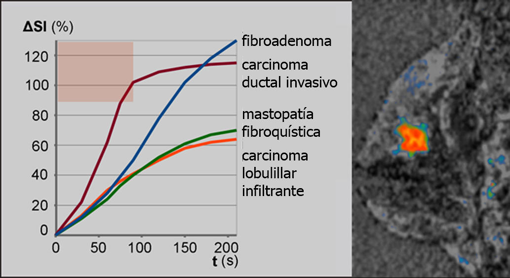 Dynamic uptake pattern of a Gd-based ECF-space agent in breast lesions. Enhancement of more than 90% in less than 90s (reddish area) after bolus injection occurs most likely in invasive ductal carcinomas only. Thus, such tumors can be identified in parametric images, where all pixels with enhancement >90% at time ≤90 s can be color-coded. The carcinoma is this picture appears in bright red.