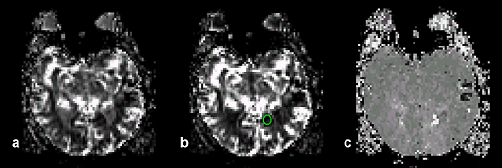 (c) Time-to-peak image of the same slice. The perfusion in the ischemic region is delayed; it shows up in light gray.