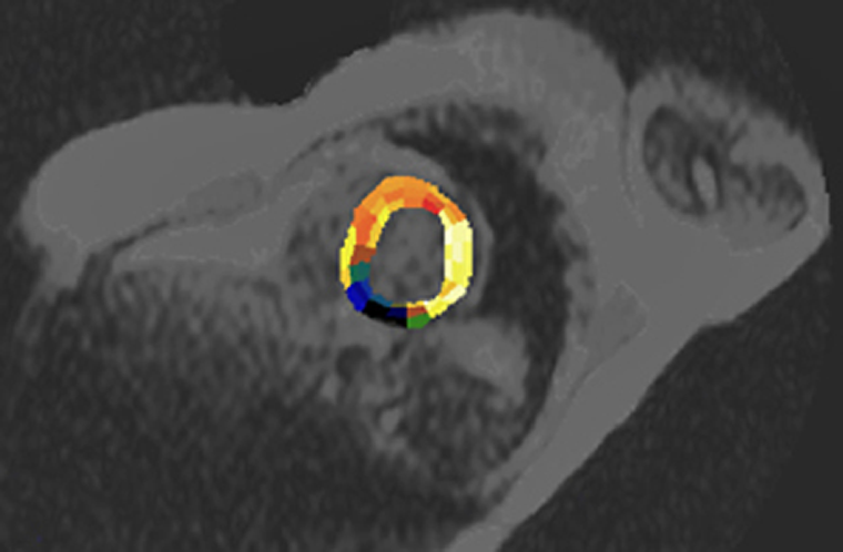 In this case, the heart is semi-automatically divided into ROIs which follow the supply area of the coronary arteries. The parametric image represents the cross-correlation coefficient (CCC) calculated one week after coronary infarction (dark area). See also Chapter 14.