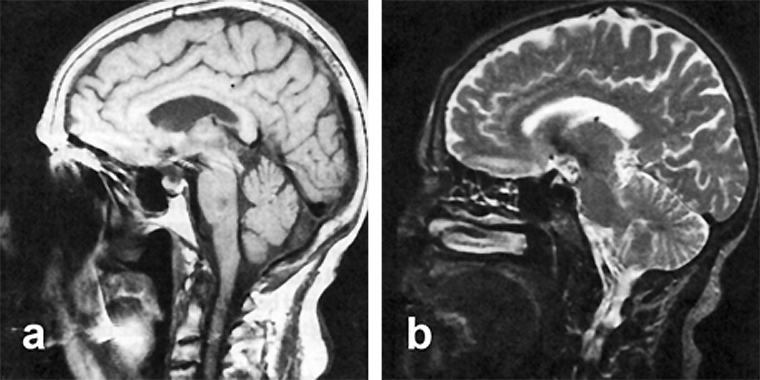 (a) Intermediately weighted image, and (b) T2-weighted image. On the left image, a low signal intensity area is seen in the pons, suggesting a lesion. This lesion is not visible on the T2-weighted image. It is caused by image distortion created by ferromagnetic implants.