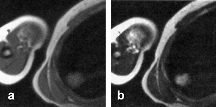 (a) Transverse intermediately, and (b) T2-weighted images depict an ill-defined high signal intensity lesion in the right lung. Follow-up studies on another day and the use of CT did not show such a lesion. The cause of the artifact remained unclear.