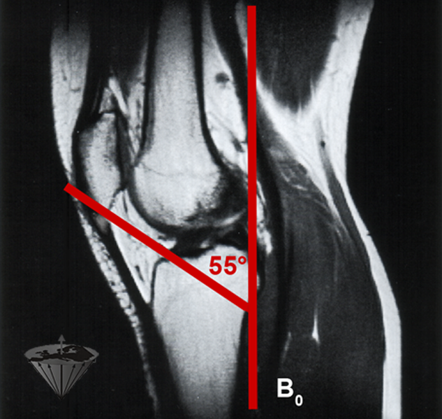 When tendons in an MR imaging equipment are aligned at an angle of 54.7° relative to B₀, the dipole coupling descends to zero. This was first reported in 1985 by Fullerton and colleagues [⇒ Fullerton 1985]; they described an increase in T2 of the achilles tendon from 0.6 to 22 ms.