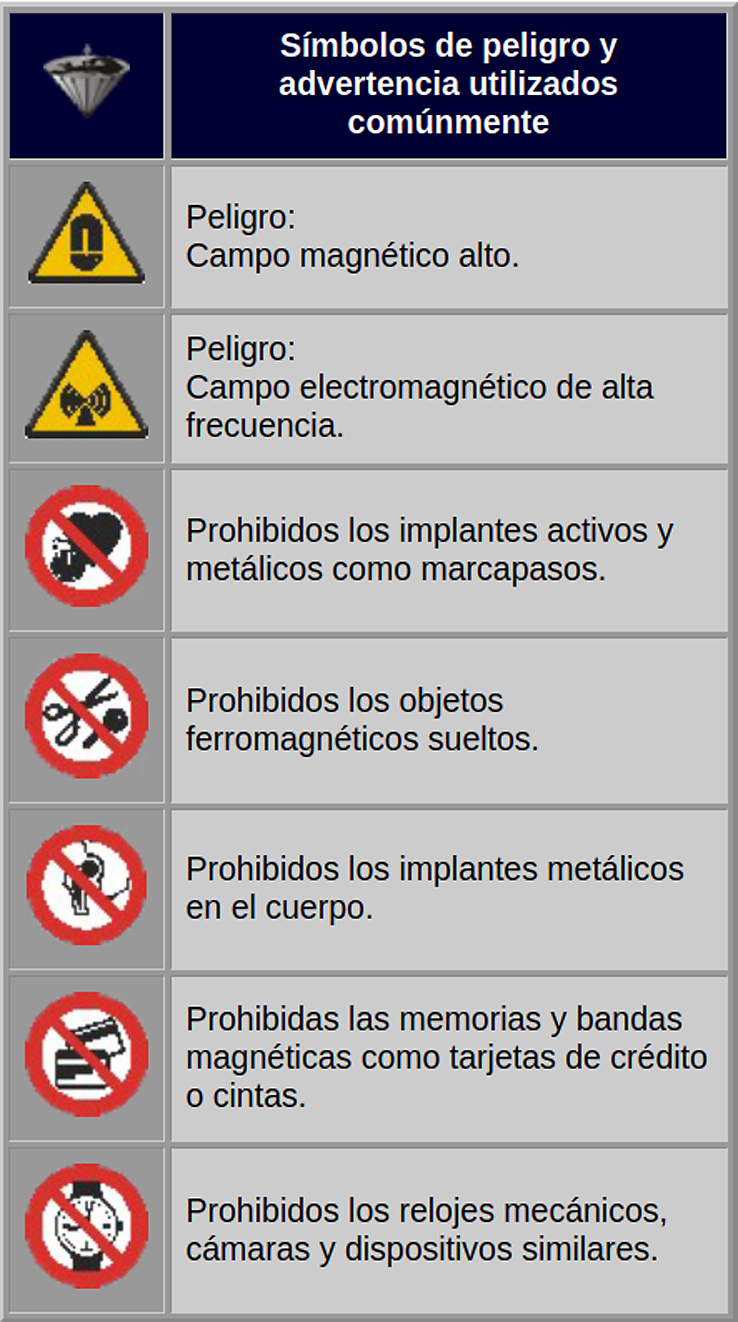 Danger and prohibition symbols and signs used worldwide at MR installations.