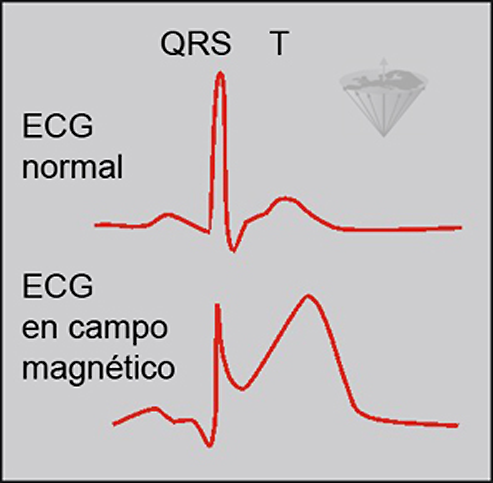 Flowing blood can behave as a moving conductor in a magnetic field. The field can induce a voltage that will be highest during the part of the cardiac cycle with the fastest blood velocity. This coincides with the T-wave of the ECG and enhances the T-wave, potentially mimicking pathology.