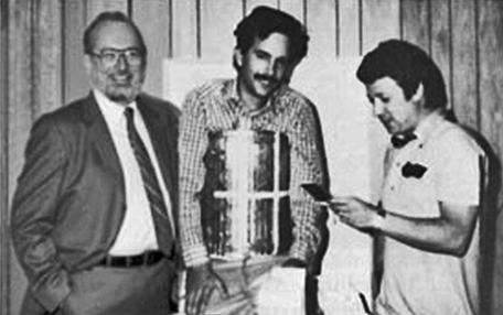 Tras más de cuatro horas en la máquina prototipo del laboratorio de Paul C. Lauterbur: Las primeras imágenes tridimensionales del corazón obtenidas mediante sincronización con ECG, 1982. De izquierda a derecha: Paul C. Lauterbur, Peter A. Rinck y Robert N. Muller.